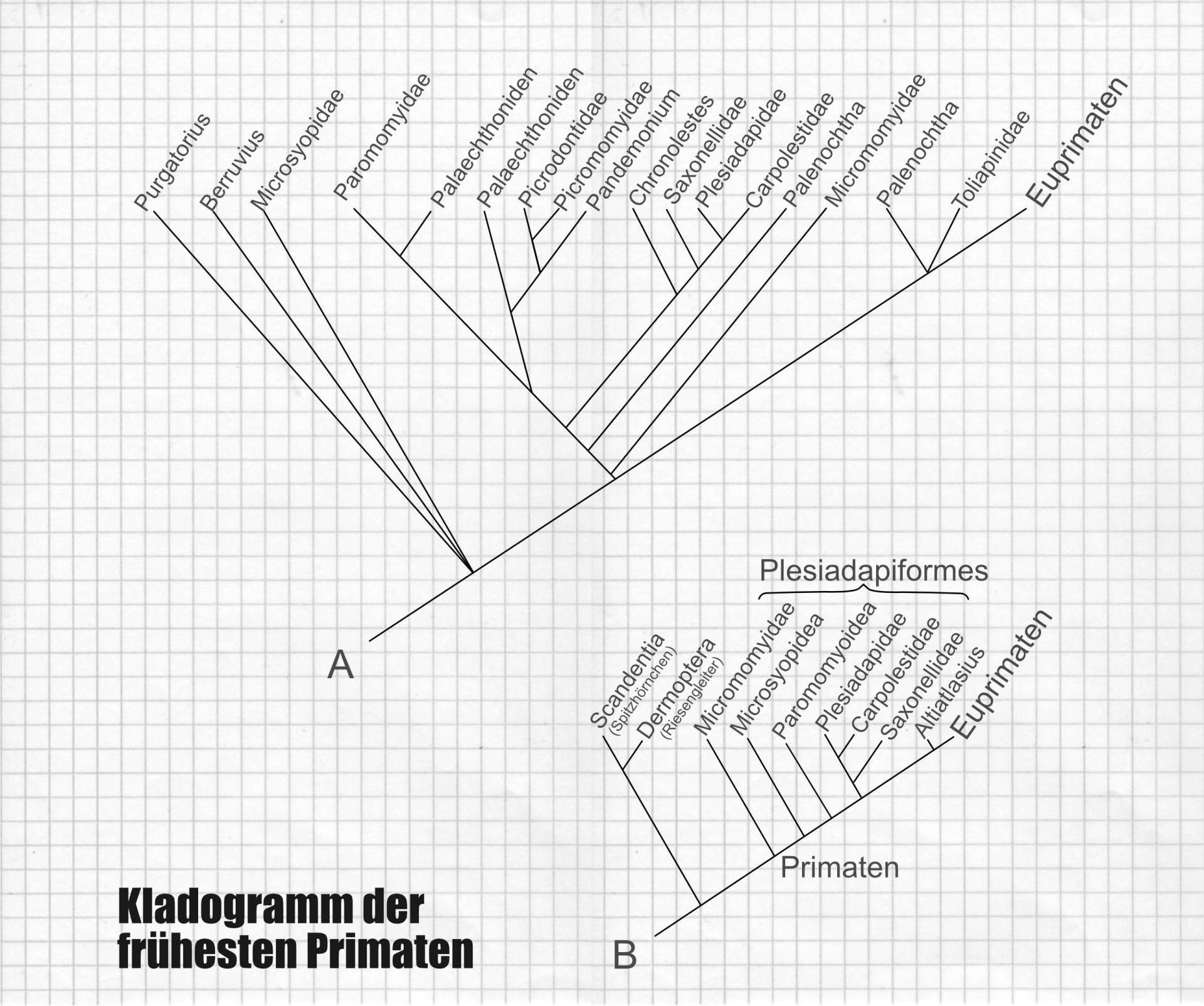 Dieses Kladogramm der frühesten Primaten zeigt die verwandtschaftlichen Beziehungen der Plesiadapiformes. (A) vereinfacht nach Silcox,2001 und (B) Modifikation nach Bloch und Boyer, 2003. Die Palaechtoniden und Palenochtha sind paraphyletische basale Taxa und tauchen auf mehreren Stellen in Kladogramm (A) auf!